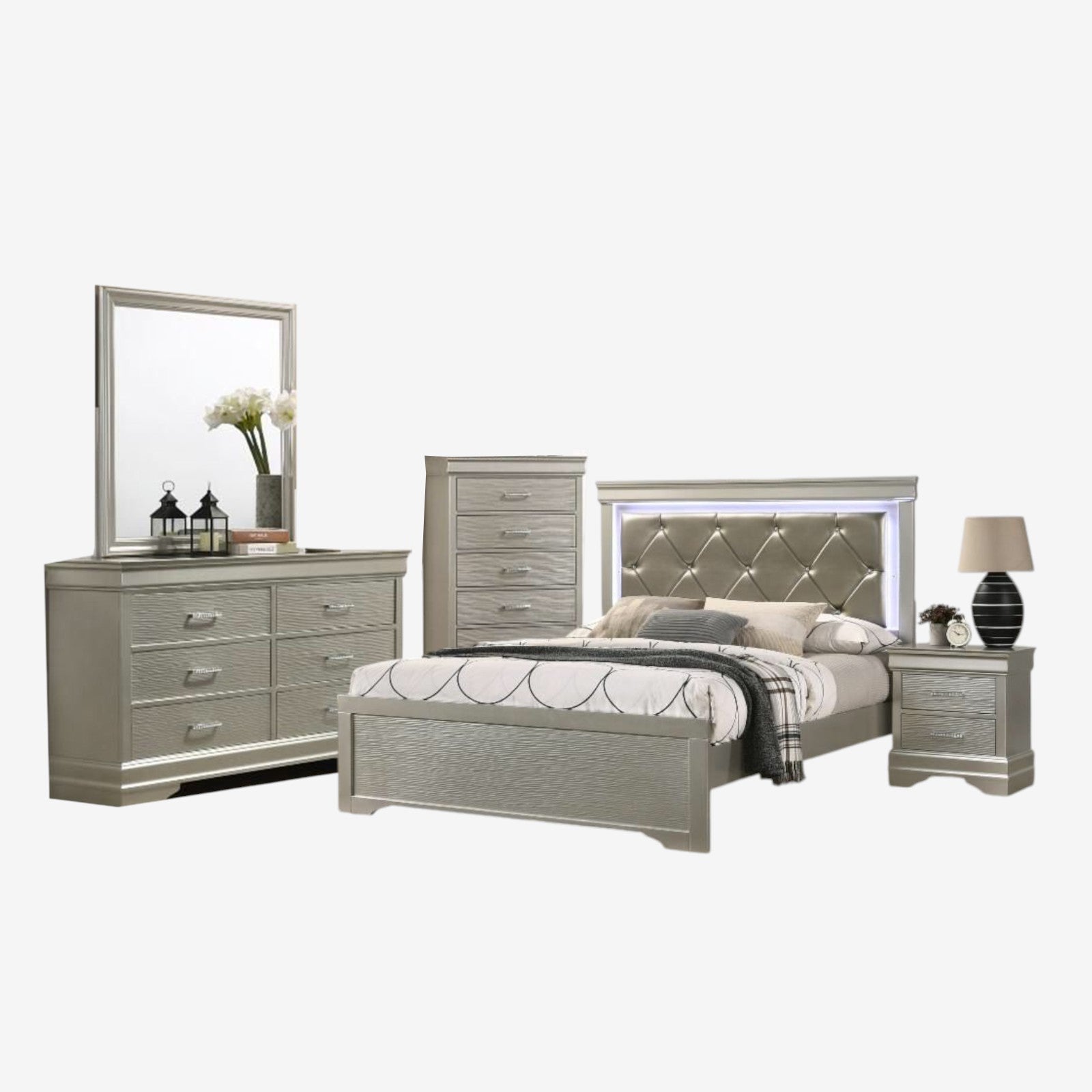 8-Piece Set: Includes 01 King/ Queen Bedframe (Headboard, Footboard, Rails), 01 Dresser, 01 Mirror, 02 Nightstands and 01 Storage Chest.