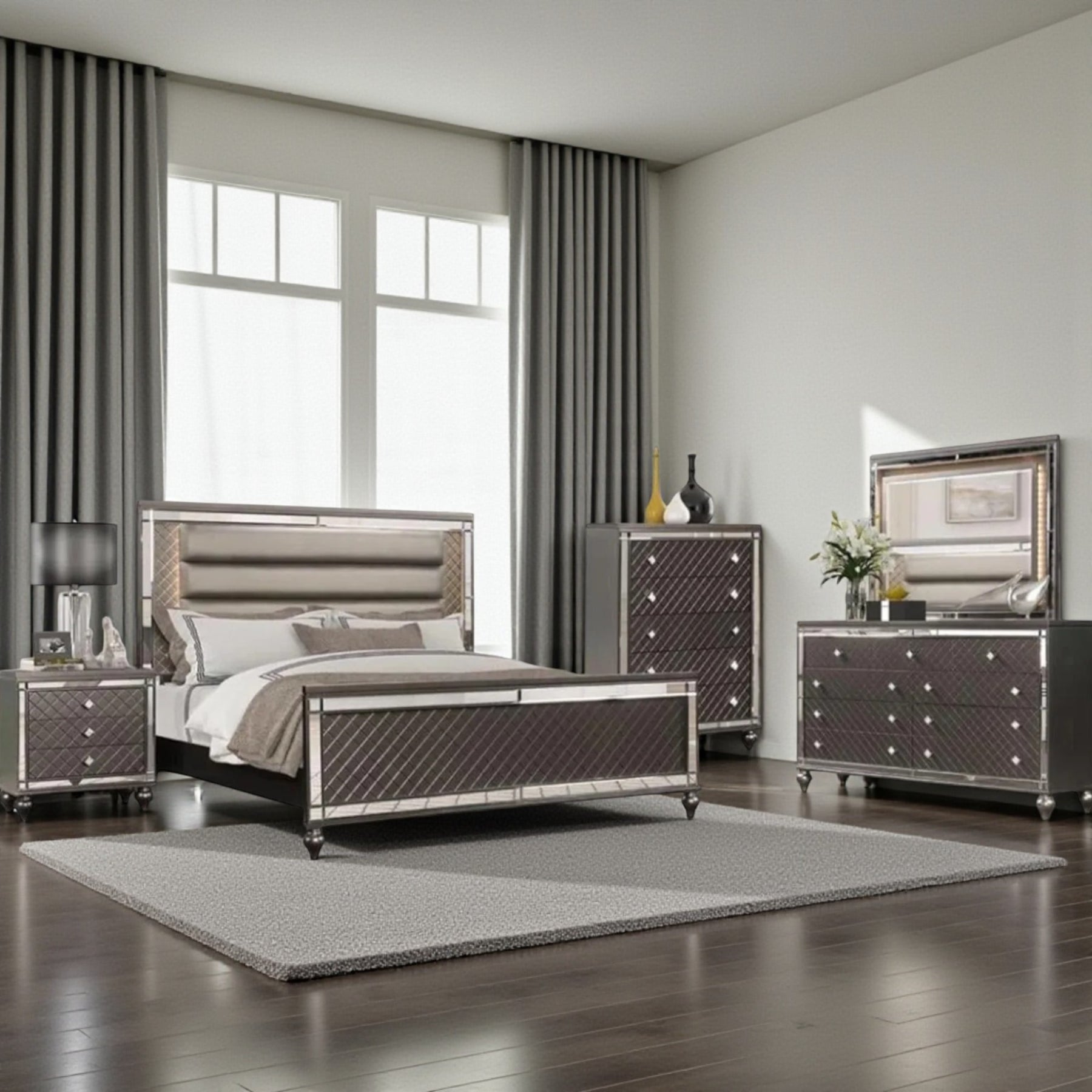 Experience a new level of modern elegance with the Majesty Bedroom Set, a refined collection that combines sophistication, durability, and innovative design. This luxurious set includes a King or Queen-sized bed frame (headboard, footboard and rails), two nightstands, a dresser with a stylish beveled mirror, and a spacious storage chest, crafted to transform your bedroom into a haven of contemporary style and functionality.
