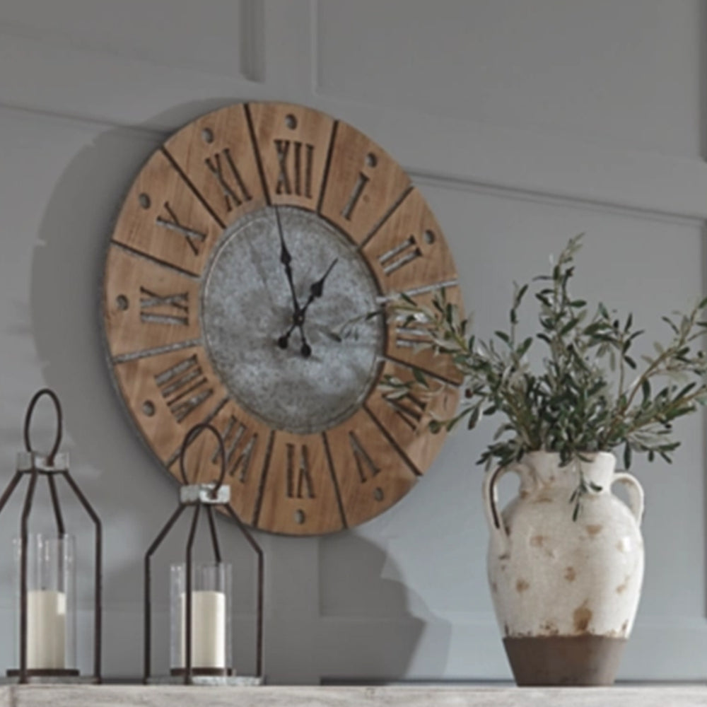 Timeless charm meets rustic elegance with Payson Wall Clock by Ashley Furniture. Showcasing a perfect blend of industrial farmhouse aesthetics, it features a beautifully crafted natural wood frame that exudes warmth and character. The oversized Roman numerals, fashioned from galvanized metal, add a bold contrast while enhancing its vintage appeal. A sunburst-inspired center detail brings a touch of artistry, making this clock more than just a timepiece—it’s a statement of style. With its generous scale, it effortlessly becomes a captivating focal point, perfect for enhancing your living room, dining area, or entryway.
