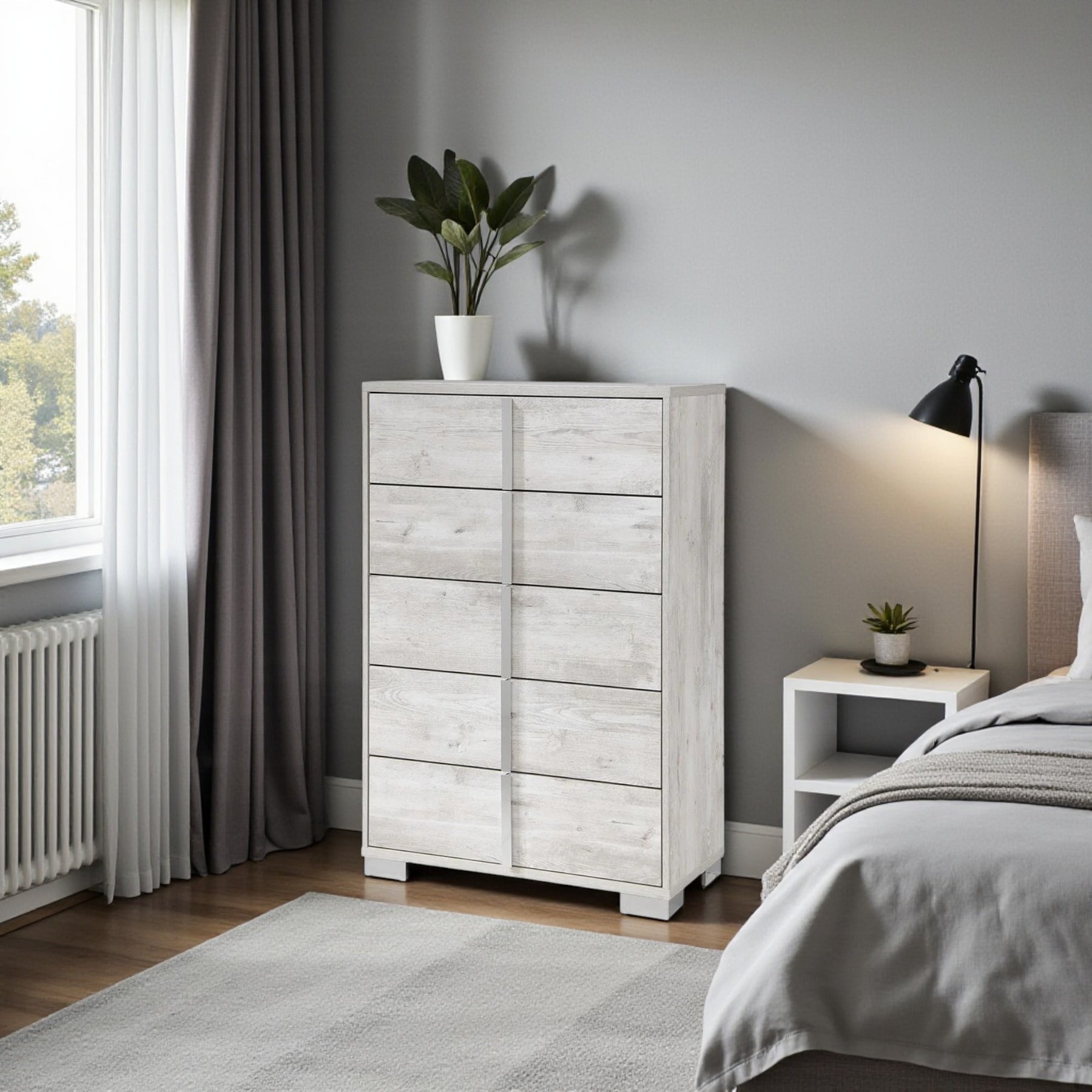 Vertical Metallic Handles: Each drawer is adorned with sleek vertical metallic handles, adding a modern touch to the dresser's overall design.
